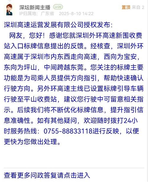 網(wǎng)友,您好!感謝您就深圳外環(huán)高速新圍收費(fèi)站入口標(biāo)牌信息提出的反饋。經(jīng)核查,深圳外環(huán)高速屬于深圳市內(nèi)東西走向高速,西向?yàn)閷毎?,東向?yàn)槠荷?,中間跨越東莞。您關(guān)注的標(biāo)牌主要功能是為司乘人員提供方向指引,幫助快速確認(rèn)行駛方向。另外環(huán)高速主線已設(shè)置標(biāo)牌引導(dǎo)車輛行駛至平山收費(fèi)站,建議您行駛中可留意相關(guān)指示。后續(xù)我們將不斷優(yōu)化標(biāo)牌信息,提升指引信息準(zhǔn)確性。如有其他疑問,歡迎隨時撥打24小時服務(wù)熱線:0755-88833118進(jìn)行反映,以便更快為您做出處理。