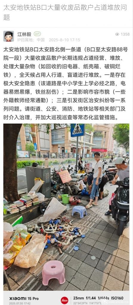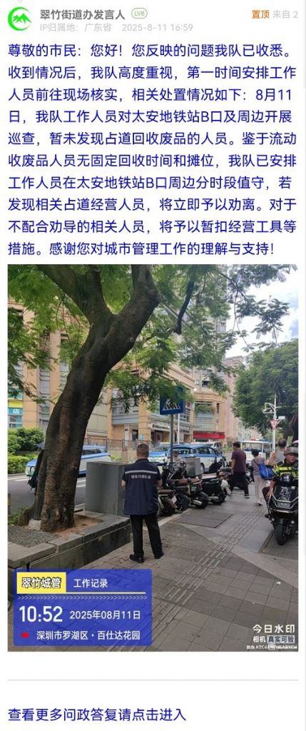 尊敬的市民:您好!您反映的問題我隊(duì)已收悉。收到情況后,我隊(duì)高度重視,第一時間安排工作人員前往現(xiàn)場核實(shí),相關(guān)處置情況如下:8月11日,我隊(duì)工作人員對太安地鐵站B口及周邊開展巡查,暫未發(fā)現(xiàn)占道回收廢品的人員。鑒于流動收廢品人員無固定回收時間和攤位,我隊(duì)已安排工作人員在太安地鐵站B口周邊分時段值守,若發(fā)現(xiàn)相關(guān)占道經(jīng)營人員,將立即予以勸離。對于不配合勸導(dǎo)的相關(guān)人員,將予以暫扣經(jīng)營工具等措施。感謝您對城市管理工作的理解與支持!