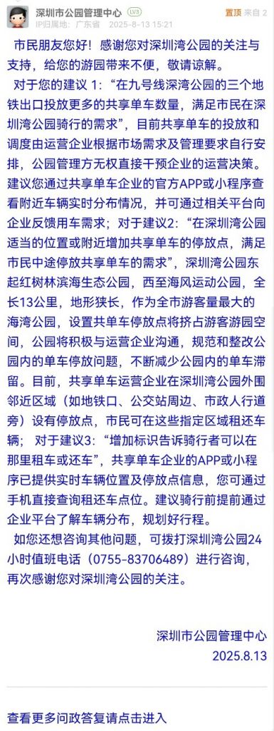 對于您的建議 1:“在九號線深灣公園的三個地鐵出口投放更多的共享單車數(shù)量,滿足市民在深圳灣公園騎行的需求”,目前共享單車的投放和調(diào)度由運(yùn)營企業(yè)根據(jù)市場需求及管理要求自行安排,公園管理方無權(quán)直接干預(yù)企業(yè)的運(yùn)營決策。建議您通過共享單車企業(yè)的官方APP或小程序查看附近車輛實(shí)時分布情況,并可通過相關(guān)平臺向企業(yè)反饋用車需求;對于建議2:“在深圳灣公園適當(dāng)?shù)奈恢没蚋浇黾庸蚕韱诬嚨耐7劈c(diǎn),滿足市民中途停放共享單車的需求”,深圳灣公園東起紅樹林濱海生態(tài)公園,西至海風(fēng)運(yùn)動公園,全長13公里,地形狹長,作為全市游客量最大的海灣公園,設(shè)置共單車停放點(diǎn)將擠占游客游園空間,公園將積極與運(yùn)營企業(yè)溝通,規(guī)范和整改公園內(nèi)的單車停放問題,不斷減少公園內(nèi)的單車滯留。目前,共享單車運(yùn)營企業(yè)在深圳灣公園外圍鄰近區(qū)域(如地鐵口、公交站周邊、市政人行道旁)設(shè)有停放點(diǎn),市民可在這些指定區(qū)域租還車輛; 對于建議3:“增加標(biāo)識告訴騎行者可以在那里租車或還車”,共享單車企業(yè)的APP或小程序已提供實(shí)時車輛位置及停放點(diǎn)信息,您可通過手機(jī)直接查詢租還車點(diǎn)位。建議騎行前提前通過企業(yè)平臺了解車輛分布,規(guī)劃好行程。