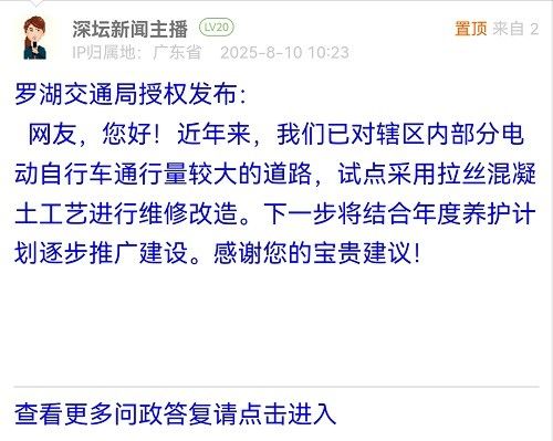 網(wǎng)友,您好!近年來,我們已對轄區(qū)內(nèi)部分電動自行車通行量較大的道路,試點(diǎn)采用拉絲混凝土工藝進(jìn)行維修改造。下一步將結(jié)合年度養(yǎng)護(hù)計(jì)劃逐步推廣建設(shè)。感謝您的寶貴建議!