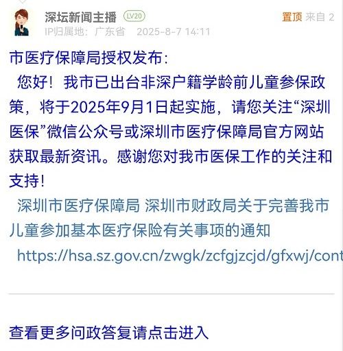 您好!我市已出臺非深戶籍學(xué)齡前兒童參保政策,將于2025年9月1日起實(shí)施,請您關(guān)注“深圳醫(yī)?!蔽⑿殴娞柣蛏钲谑嗅t(yī)療保障局官方網(wǎng)站獲取最新資訊。感謝您對我市醫(yī)保工作的關(guān)注和支持!