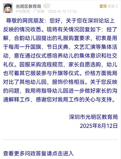 尊敬的網(wǎng)民朋友:您好,關(guān)于您在深圳論壇上反映的情況收悉?,F(xiàn)將有關(guān)情況回復(fù)如下:經(jīng)了解,合韻幼兒園提出的禮服購置要求,初衷是用于每周一升國旗、節(jié)日慶典、文藝匯演等集體活動,意在通過儀式感培養(yǎng)幼兒的集體意識和社交禮儀。園服采購流程規(guī)范,家長自愿選購,幼兒也可著其它服裝參與升旗等儀式。價(jià)格方面我局對比了其他幼兒園,服飾價(jià)格相當(dāng)。關(guān)于您反映的問題,我局將指導(dǎo)幼兒園進(jìn)一步做好家長的溝通解釋工作,感謝您對我局工作的關(guān)心與支持。