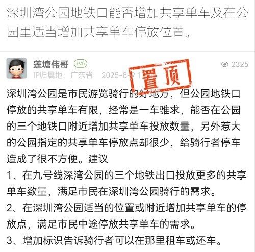 31. 帖文《深圳灣公園地鐵口能否增加共享單車及在公園里適當(dāng)增加共享單車停放位置。》