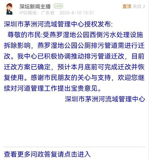 尊敬的市民:受燕羅濕地公園西側(cè)污水處理設(shè)施拆除影響,燕羅濕地公園公廁排污管道需進(jìn)行遷改。我中心已積極協(xié)調(diào)推動排污管道遷改,目前遷改方案已確定,預(yù)計(jì)本月底前可完成遷改并恢復(fù)使用。感謝市民朋友的關(guān)心與支持,歡迎您繼續(xù)對河道管理工作提出寶貴意見。