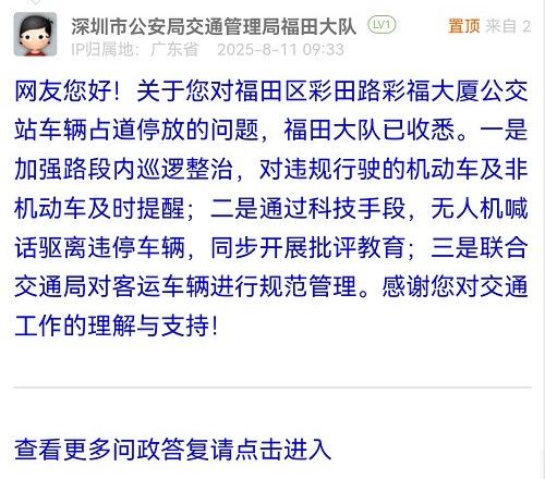 網(wǎng)友您好!關(guān)于您對福田區(qū)彩田路彩福大廈公交站車輛占道停放的問題,福田大隊(duì)已收悉。一是加強(qiáng)路段內(nèi)巡邏整治,對違規(guī)行駛的機(jī)動車及非機(jī)動車及時提醒;二是通過科技手段,無人機(jī)喊話驅(qū)離違停車輛,同步開展批評教育;三是聯(lián)合交通局對客運(yùn)車輛進(jìn)行規(guī)范管理。感謝您對交通工作的理解與支持!