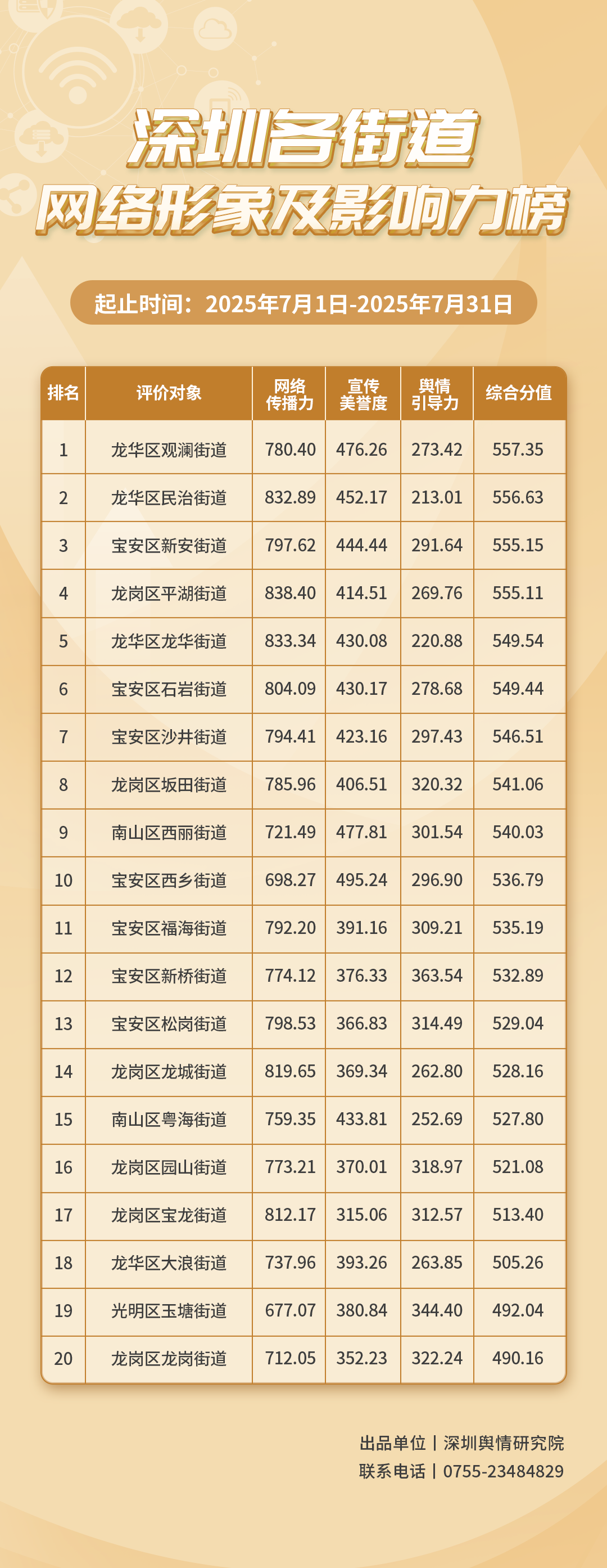 2025年7月,共有20個(gè)街道登上《深圳各街道網(wǎng)絡(luò)形象及影響力榜》,分別是:龍華區(qū)觀瀾街道、龍華區(qū)民治街道、寶安區(qū)新安街道、龍崗區(qū)平湖街道、龍華區(qū)龍華街道、寶安區(qū)石巖街道、寶安區(qū)沙井街道、龍崗區(qū)坂田街道、南山區(qū)西麗街道、寶安區(qū)西鄉(xiāng)街道、寶安區(qū)福海街道、寶安區(qū)新橋街道、寶安區(qū)松崗街道、龍崗區(qū)龍城街道、南山區(qū)粵海街道、龍崗區(qū)園山街道、龍崗區(qū)寶龍街道、龍華區(qū)大浪街道、光明區(qū)玉塘街道、龍崗區(qū)龍崗街道。