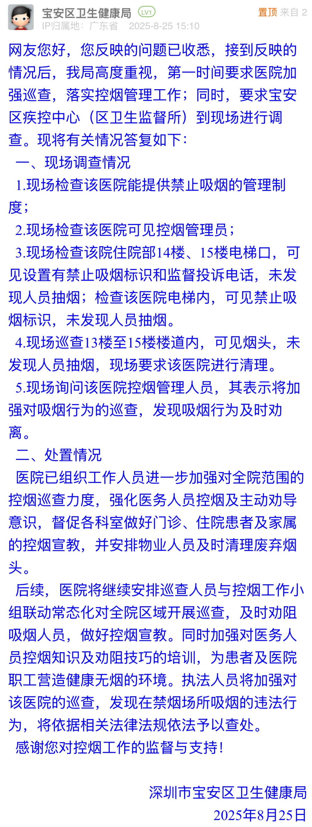 優(yōu)化建議:接到市民反饋后,寶安區(qū)衛(wèi)生健康局快速組織現(xiàn)場調(diào)查,核實醫(yī)院有禁煙制度、控?zé)煿芾韱T在崗,基礎(chǔ)控?zé)煷胧┖瞬榈轿?,值得點贊。但回應(yīng)中多次強(qiáng)調(diào)“未發(fā)現(xiàn)人員抽煙”,回避對歷史吸煙行為處置、煙頭來源及勸阻機(jī)制失效的解釋,與市民關(guān)切脫節(jié),難以消除市民對醫(yī)院日???zé)熌芰Φ膿?dān)憂,建議完善具體控?zé)煷胧?,如加裝煙感報警裝置,建立核查公示制度等,筑牢“無煙醫(yī)院”防線。