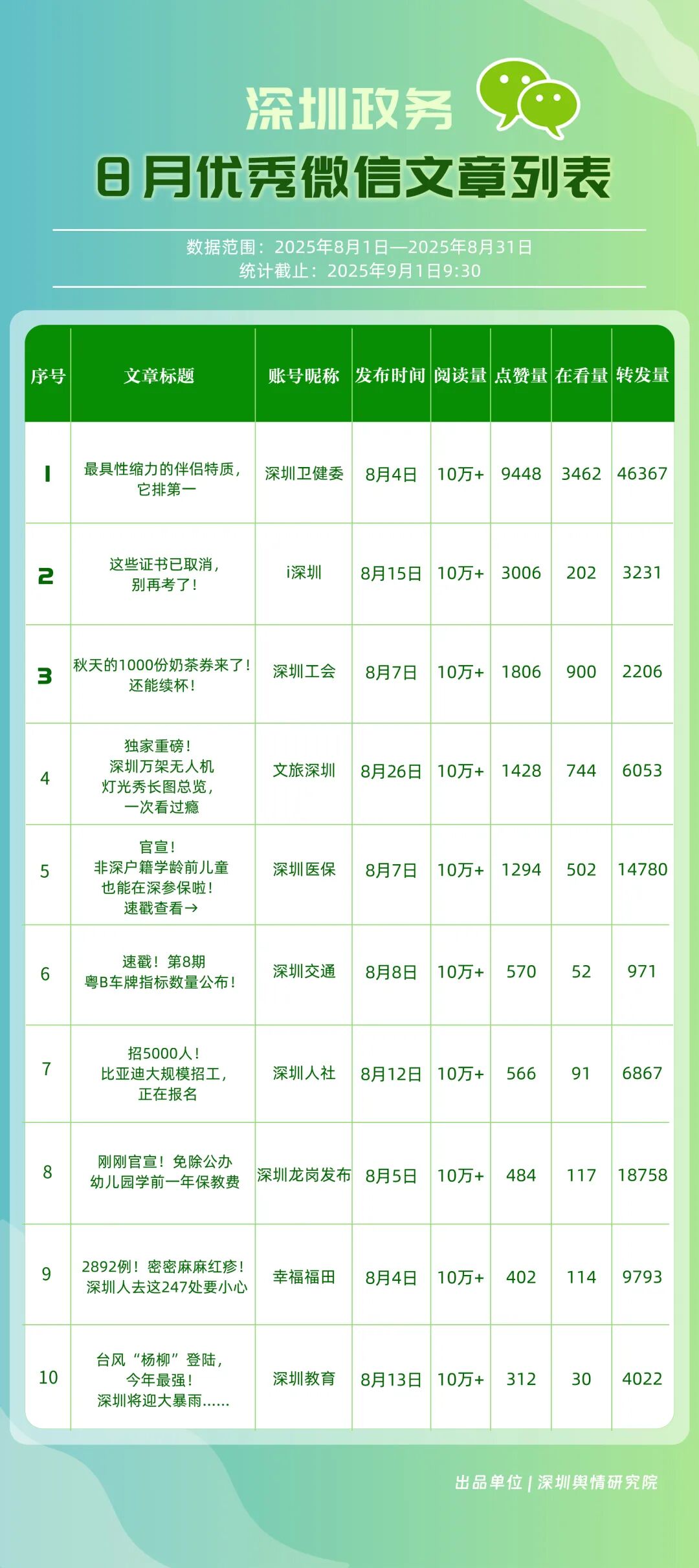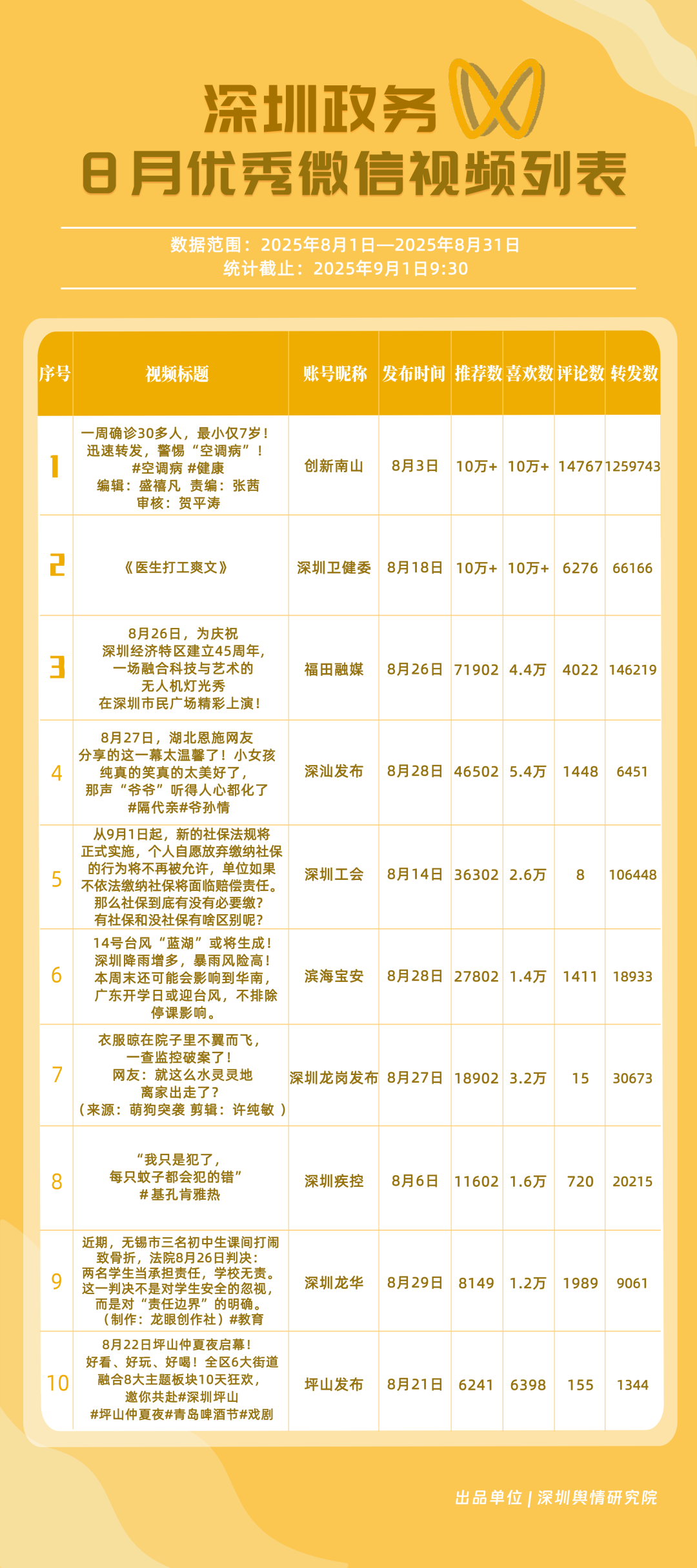 8月,“深圳幸福福田”“深圳消防”“深圳衛(wèi)健委”“創(chuàng)新南山”“深圳人社”“羅湖發(fā)布”“深圳龍崗發(fā)布”“深圳龍華”“青春深圳”“坪山發(fā)布”共10個(gè)政務(wù)頭條號(hào)入選“優(yōu)秀政務(wù)頭條號(hào)”榜單?!吧钲谛腋8L铩睉{借持續(xù)優(yōu)異的綜合表現(xiàn),以滿分成績(jī)穩(wěn)居榜單首位,彰顯出強(qiáng)大的政務(wù)傳播力與影響力;“深圳消防”“深圳衛(wèi)健委”則以穩(wěn)定的內(nèi)容質(zhì)量與深厚的民眾基礎(chǔ),持續(xù)為市民提供權(quán)威、及時(shí)的服務(wù)信息,排名穩(wěn)固?!皠?chuàng)新南山”“深圳人社”等上榜賬號(hào)亦表現(xiàn)亮眼,聚焦民生服務(wù)傳遞政策溫度,共同構(gòu)成政務(wù)新媒體矩陣的中堅(jiān)力量,為城市治理與民生服務(wù)注入鮮活動(dòng)能。
