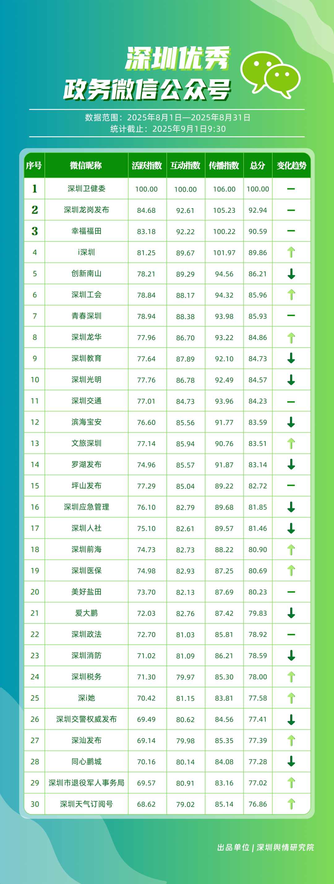 8月,30個(gè)政務(wù)微信公眾號(hào)入選“深圳優(yōu)秀政務(wù)微信公眾號(hào)”榜單,其中包括“深圳衛(wèi)健委”“深圳龍崗發(fā)布”“幸福福田”“i深圳”“創(chuàng)新南山”“深圳工會(huì)”“青春深圳”“深圳龍華”“深圳教育”“深圳光明”等。8月,“深圳衛(wèi)健委”66篇推文獲得超10萬次閱讀,以滿分位于榜單首位;“深圳龍崗發(fā)布”積極傳遞民生信息,依托區(qū)域活動(dòng)開展宣傳,推動(dòng)傳播效果顯著提升,位居第二;“幸福福田”關(guān)注區(qū)域發(fā)展動(dòng)態(tài),排名第三?!癷深圳”“創(chuàng)新南山”“深圳工會(huì)”“青春深圳”等政務(wù)賬號(hào)在信息發(fā)布中不斷提升內(nèi)容豐富性,深耕優(yōu)質(zhì)服務(wù),評(píng)分在85分以上。上榜微信公眾號(hào)立足自身特色優(yōu)勢(shì),以精品內(nèi)容為核心競(jìng)爭(zhēng)力,在政務(wù)傳播領(lǐng)域樹立了標(biāo)桿形象,成為兼具影響力與公信力的示范樣本。