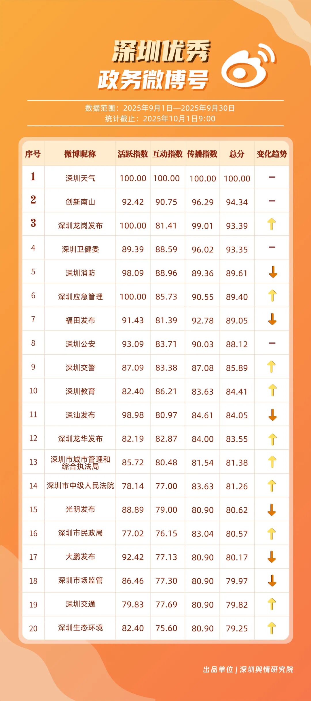 9月,20個(gè)賬號(hào)入選“優(yōu)秀政務(wù)微博號(hào)”榜單,其中包括:“深圳天氣”“創(chuàng)新南山”“深圳龍崗發(fā)布”“深圳衛(wèi)健委”“深圳消防”“深圳應(yīng)急管理”“福田發(fā)布”“深圳公安”“深圳交警”“深圳教育”等。其中,“深圳天氣”蟬聯(lián)榜首,尤其9月出現(xiàn)臺(tái)風(fēng)天氣,賬號(hào)受關(guān)注度再提升;“創(chuàng)新南山”賬號(hào)以多維度內(nèi)容策略實(shí)現(xiàn)傳播效能提升,其內(nèi)容中與歌手周深的聯(lián)動(dòng)也成為一大亮點(diǎn),獲得了較好傳播效果,以94.34分排名榜單第二;“深圳龍崗發(fā)布”“深圳衛(wèi)健委”兩賬號(hào)得分均在93分以上,在區(qū)域宣傳、內(nèi)容科普方向發(fā)力。上榜優(yōu)秀微博賬號(hào)展現(xiàn)出較高的內(nèi)容創(chuàng)新能力,以年輕化語(yǔ)態(tài)構(gòu)建傳播體系,形成兼具專業(yè)性與傳播力的優(yōu)秀案例。