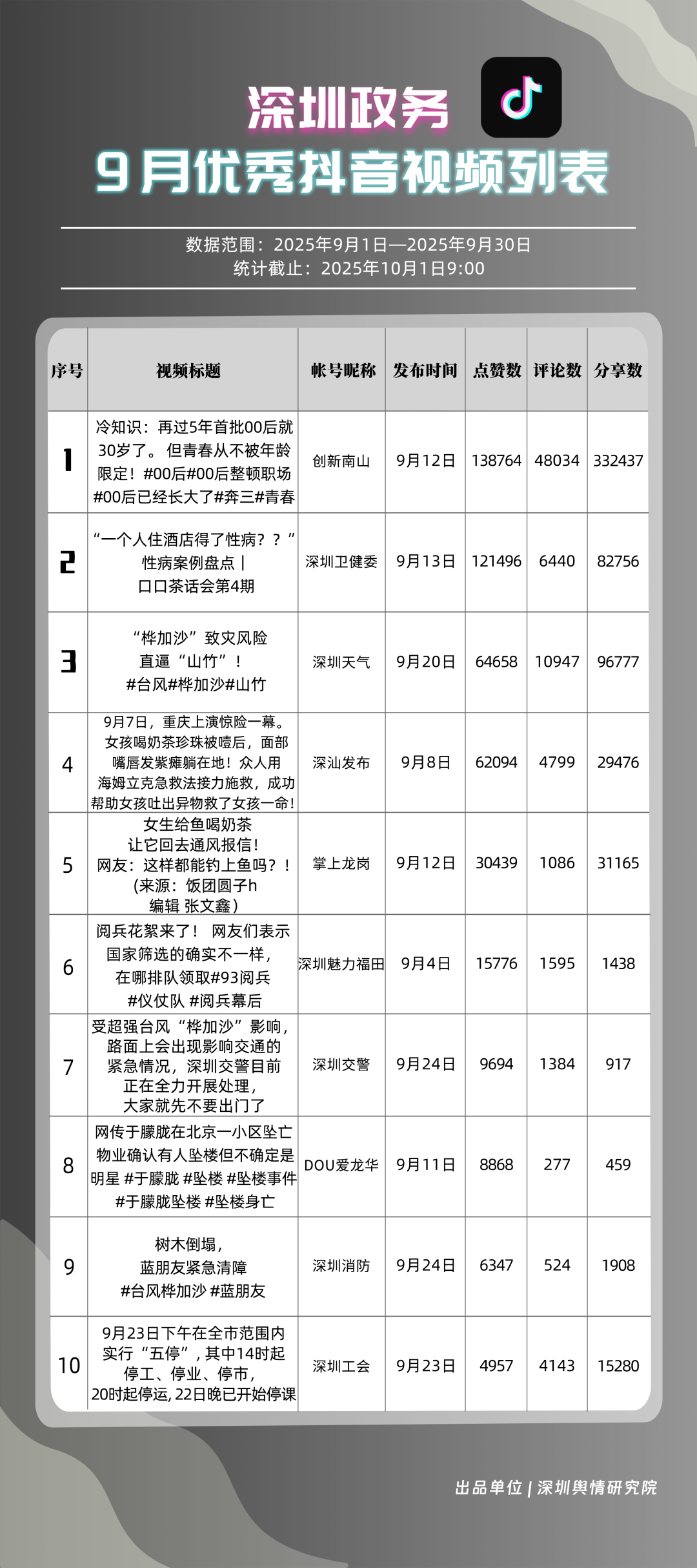 9月,獲得“優(yōu)秀政務(wù)抖音號(hào)”稱號(hào)的是“創(chuàng)新南山”“深圳天氣”“深圳衛(wèi)健委”“深圳魅力福田”“深汕發(fā)布”“掌上龍崗”“DOU愛(ài)龍華”“深圳工會(huì)”“青春深圳”“深圳交警”?!皠?chuàng)新南山”以一條有關(guān)“青春不被年齡限定”的視頻獲得超34萬(wàn)次轉(zhuǎn)發(fā),超14萬(wàn)次點(diǎn)贊,助力其在抖音榜單居于榜首;“深圳天氣”多條臺(tái)風(fēng)相關(guān)視頻吸引大量網(wǎng)民關(guān)注、互動(dòng),在抖音平臺(tái)得分超98分;“深圳衛(wèi)健委”“深圳魅力福田”“深汕發(fā)布”等賬號(hào)緊隨其后,得分均在92分以上。上榜的優(yōu)秀政務(wù)抖音號(hào)以“有溫度”的敘事表達(dá),將宣傳、服務(wù)內(nèi)容轉(zhuǎn)化為網(wǎng)民喜聞樂(lè)見(jiàn)的視頻,收獲高點(diǎn)贊、高轉(zhuǎn)發(fā)的流量實(shí)績(jī),更在評(píng)論區(qū)形成了良性互動(dòng)生態(tài),深度運(yùn)營(yíng)收獲了較好成果。