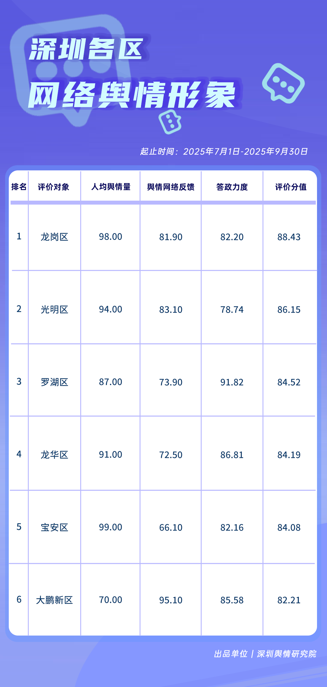 7-9月,在網(wǎng)絡(luò)輿情方面,龍崗區(qū)、光明區(qū)得分在86分以上,位居榜單前二,人均輿情量得分較高。羅湖區(qū)、龍華區(qū)、寶安區(qū)、大鵬新區(qū)在輿情治理方面也各有亮點(diǎn),充分體現(xiàn)了各區(qū)在維護(hù)清朗網(wǎng)絡(luò)空間、高效回應(yīng)公眾關(guān)切方面的積極作為與責(zé)任擔(dān)當(dāng)。