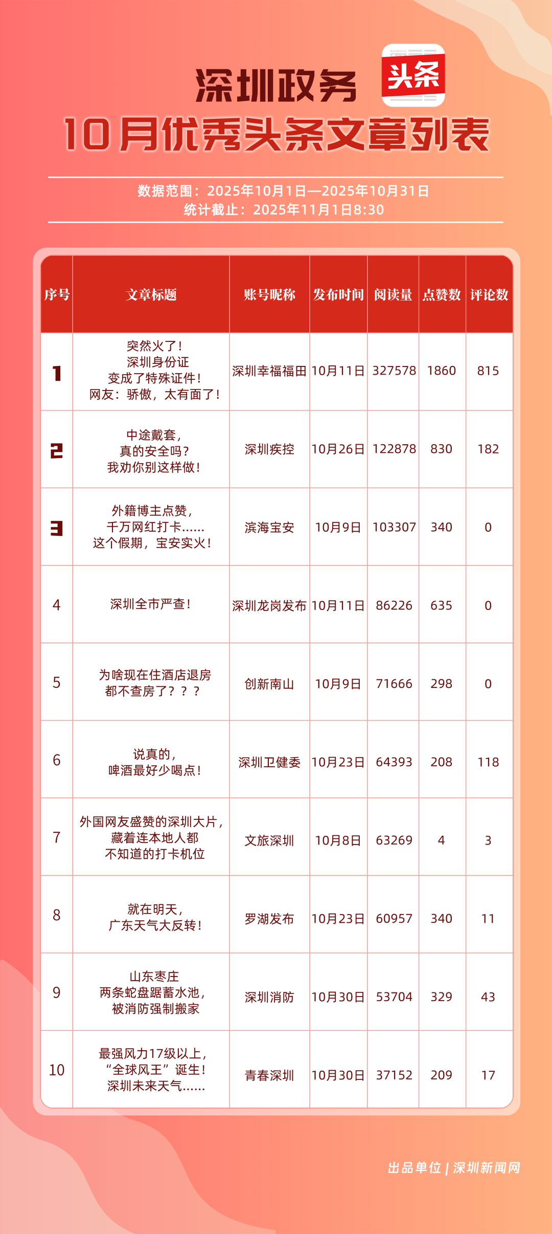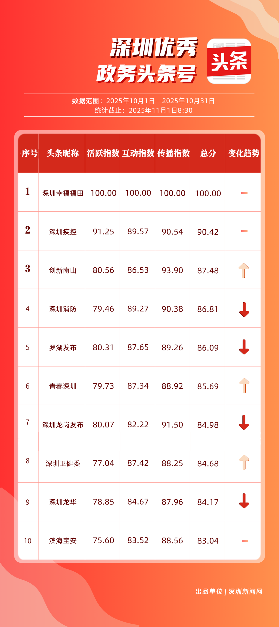 10月,“深圳幸福福田”“深圳疾控”“創(chuàng)新南山”“深圳消防”“羅湖發(fā)布”“青春深圳”“深圳龍崗發(fā)布”“深圳衛(wèi)健委”“深圳龍華”“濱海寶安”共10個政務頭條號入選“優(yōu)秀政務頭條號”榜單?!吧钲谛腋8L铩痹诨钴S、互動、傳播均收獲較好成果,蟬聯榜首;“深圳疾控”得分超90分,持續(xù)發(fā)布民生健康類內容,為市民健康保駕護航;“創(chuàng)新南山”內容創(chuàng)作緊扣民生與區(qū)域特色,位列榜單第三名?!吧钲谙馈薄傲_湖發(fā)布”等賬號也位列榜單前列,成為區(qū)域政務新媒體內容創(chuàng)新、信息傳遞的標桿。