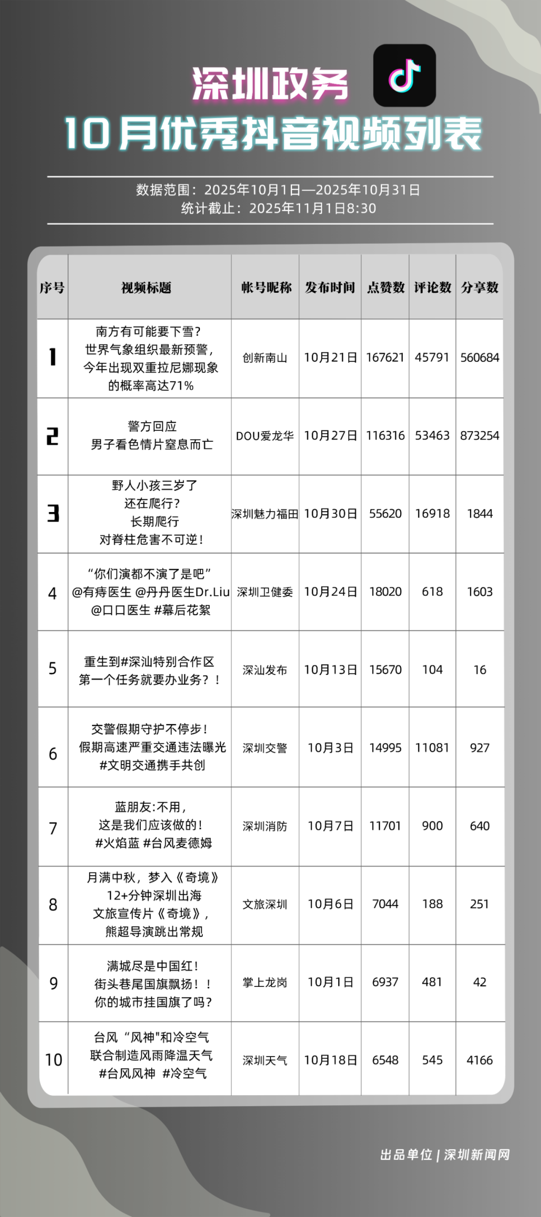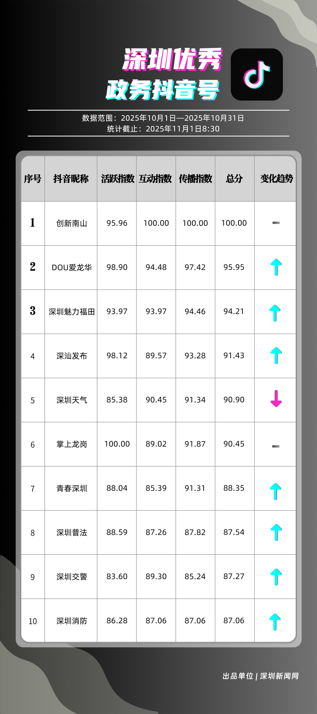 10月,獲得“優(yōu)秀政務抖音號”稱號的是“創(chuàng)新南山”“DOU愛龍華”“深圳魅力福田”“深汕發(fā)布”“深圳天氣”“掌上龍崗”“青春深圳”“深圳普法”“深圳交警”“深圳消防”?!皠?chuàng)新南山”以總分100分居于榜首,展現出其內容創(chuàng)作對用戶的強大吸引力與傳播力;“DOU愛龍華”與“深圳魅力福田”分別位列第二、三位,得分在95分左右,排名較上期有所上升?!吧钌前l(fā)布”“深圳天氣”“掌上龍崗”等賬號得分均在90分以上,以年輕化表達展示實用信息,也收獲較好互動、傳播成績。