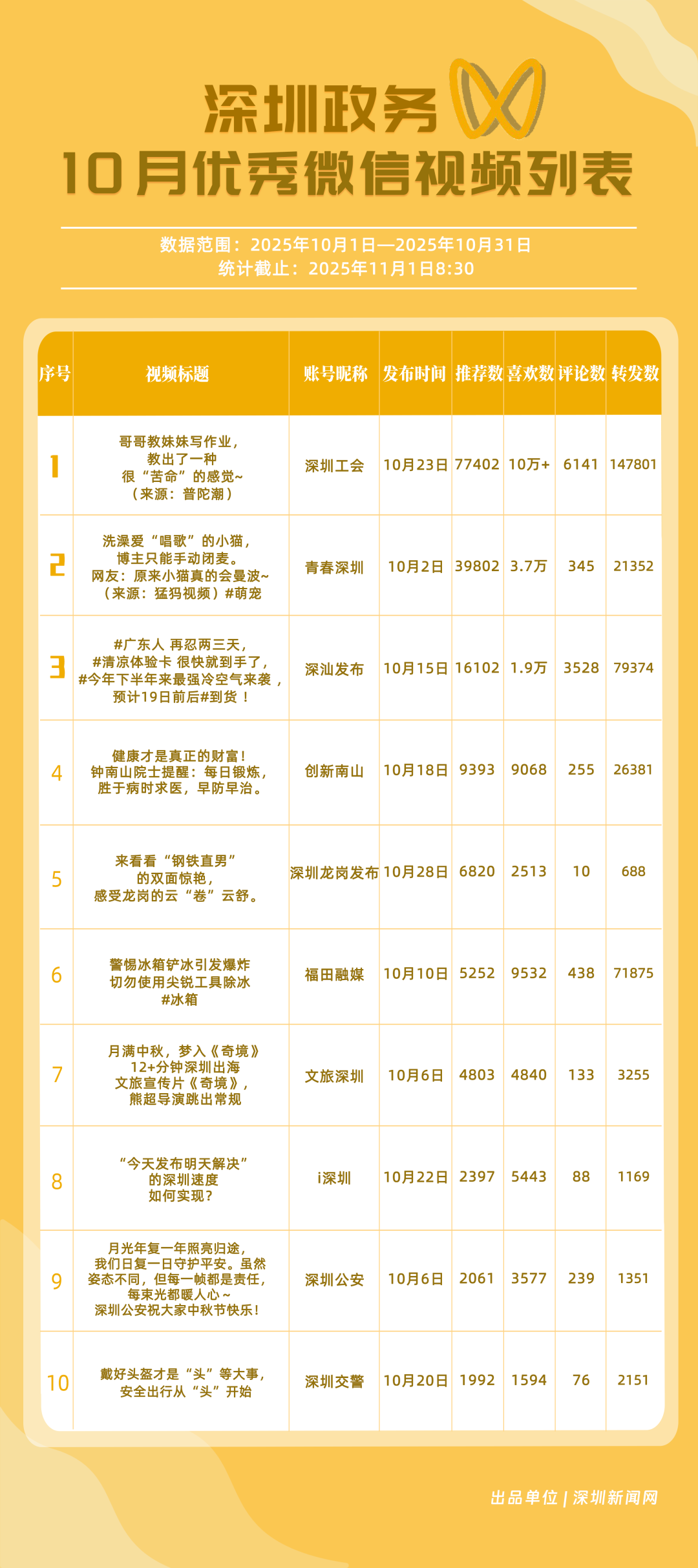 10月,“深圳工會”“深汕發(fā)布”“創(chuàng)新南山”“深圳龍崗發(fā)布”“青春深圳”“福田融媒”“深圳龍華”“濱海寶安”“深圳光明”“深圳天氣”上榜“優(yōu)秀政務微信視頻號”。其中,“深圳工會”一條有關教寫作業(yè)教出“命苦感”的視頻吸引大量網民關注,獲得超10萬次喜歡,助推其位列榜單第一名;“深汕發(fā)布”積極傳播降溫、臺風等民生信息,以99.91分位列榜單第二名;“創(chuàng)新南山”和“深圳龍崗發(fā)布”得分在95分左右,內容突出區(qū)域成績與創(chuàng)新活力,實現了政務服務與傳播效果的雙贏。上榜賬號不斷強化區(qū)域動態(tài)與民生服務的傳播,在政務新媒體賽道形成示范效應。