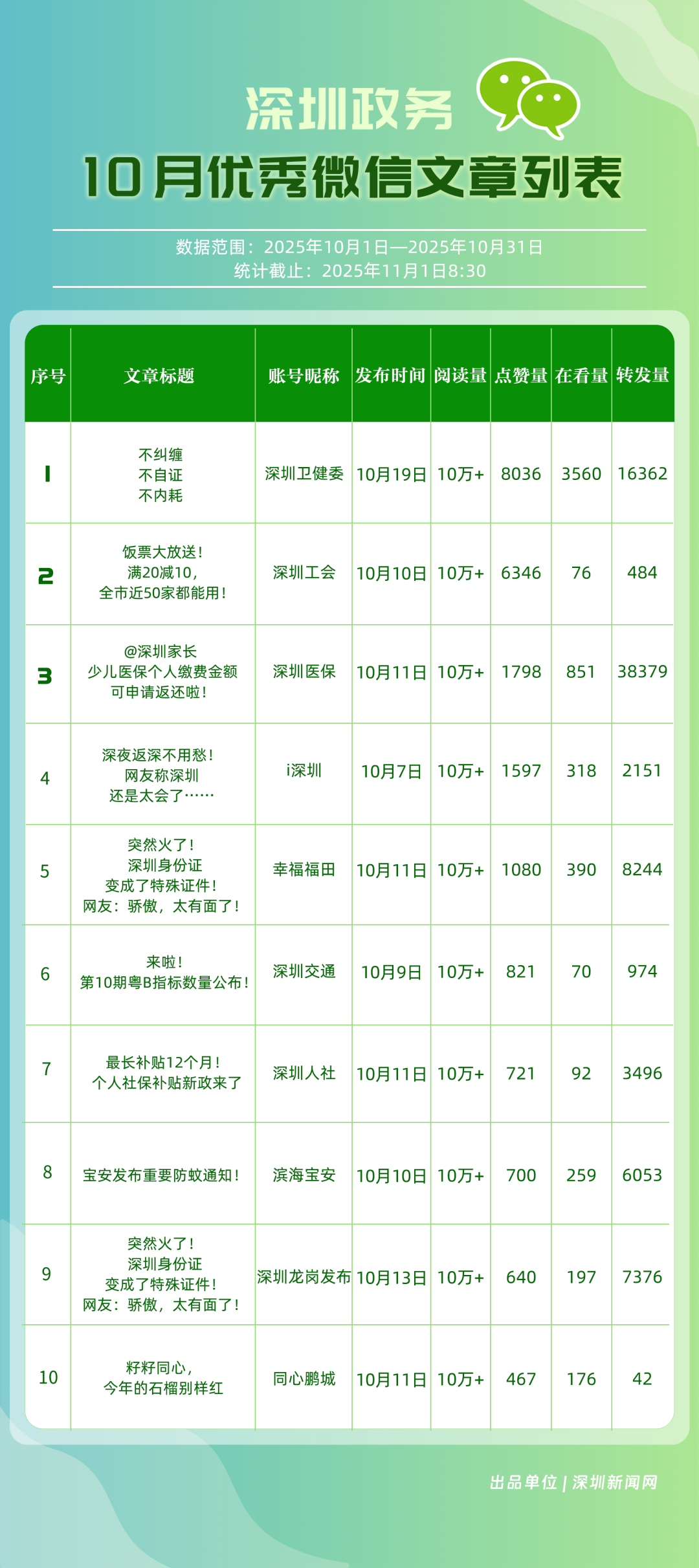 10月,“深圳衛(wèi)健委”“深圳龍崗發(fā)布”“i深圳”“幸福福田”“深圳工會”“青春深圳”“創(chuàng)新南山”“濱海寶安”“深圳龍華”“深圳光明”等30個政務微信公眾號榮登“深圳優(yōu)秀政務微信公眾號”榜單。10月,“深圳衛(wèi)健委”以總分100位居榜首,其持續(xù)以真誠、反套路的內容,將專業(yè)健康知識轉化為網民喜聞樂見的“生活指南”,受到大量網民喜愛;“深圳龍崗發(fā)布”位居第二,持續(xù)發(fā)布高質量內容,成為市民獲取龍崗動態(tài)的“第一窗口”;“i深圳”也發(fā)布政策、民生內容,排名有所上升,位列第三;“幸福福田”“深圳工會”等也立足區(qū)域特色,通過多元內容,展現各自的發(fā)展活力。
