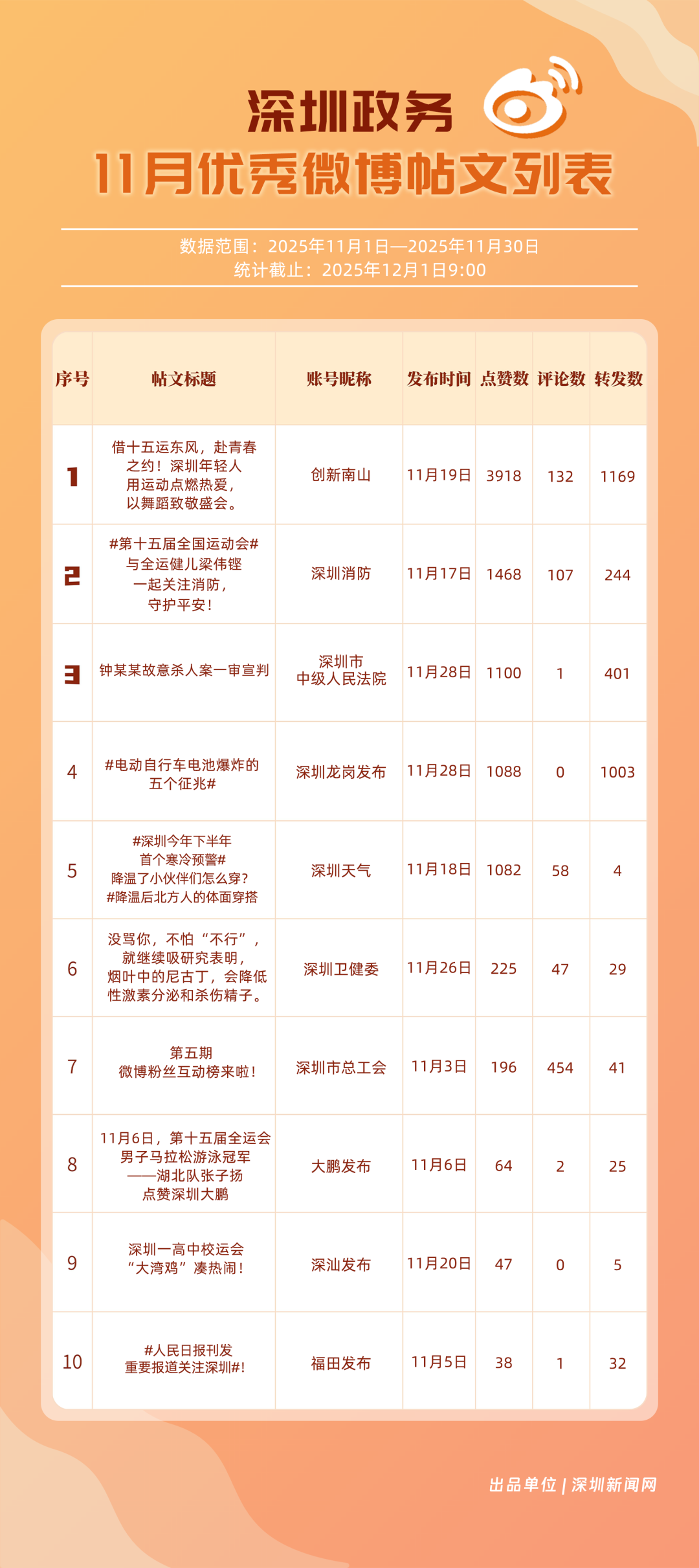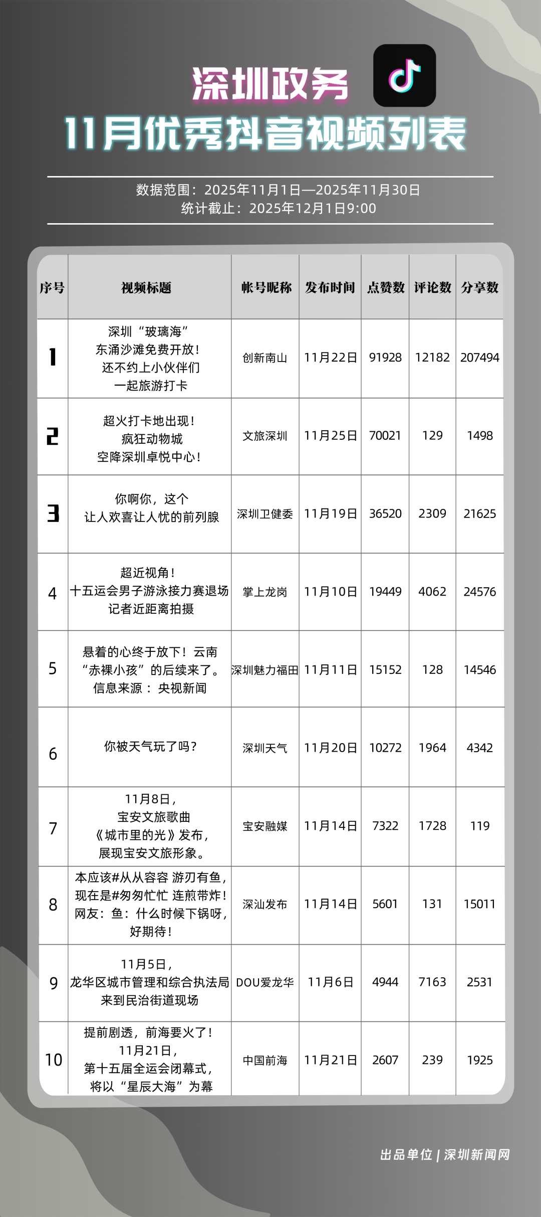 2025年11月期《深圳優(yōu)秀政務新媒體矩陣》正式發(fā)布,本期上榜矩陣持續(xù)提升傳播效能,通過各類創(chuàng)新實踐在政務傳播賽道強勢突圍,用“民生關切+區(qū)域特色”的內(nèi)容創(chuàng)作,攜手構(gòu)建起深圳政務傳播的新圖景,為政務新媒體的高質(zhì)量發(fā)展增添新能量。