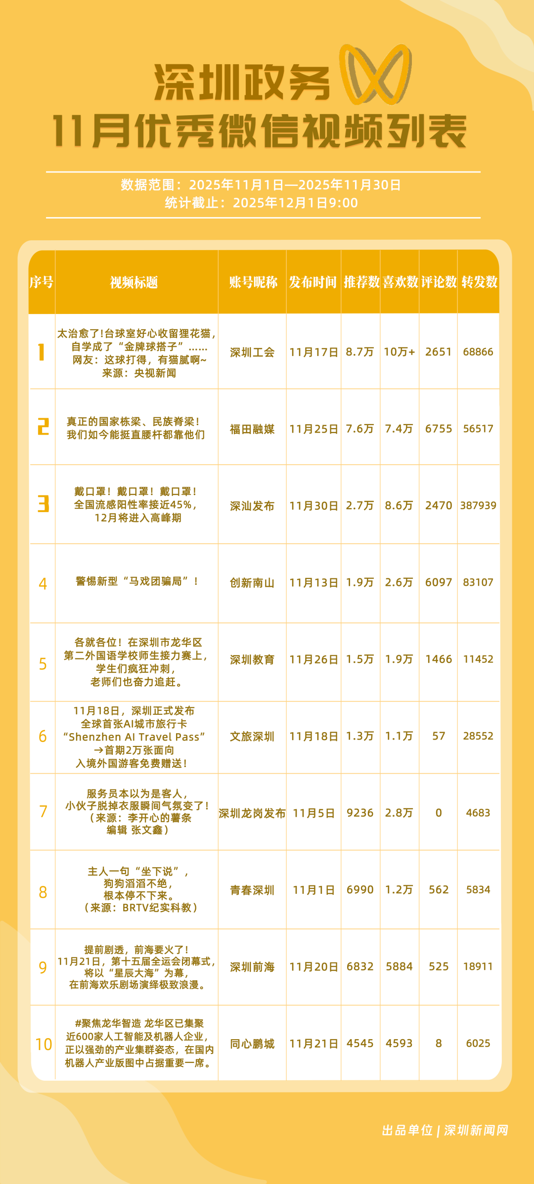 11月,“福田融媒”“深汕發(fā)布”“深圳工會”“創(chuàng)新南山”“深圳教育”“文旅深圳”“深圳光明”“深圳應急管理”“深圳天氣”“深圳龍華”榮獲“優(yōu)秀政務微信視頻號”稱號。“福田融媒”月總轉(zhuǎn)發(fā)量超60萬次,各方面發(fā)揮穩(wěn)定,位居榜單第一;“深汕發(fā)布”一條“流感陽性”視頻提醒市民關注健康信息,單條視頻轉(zhuǎn)發(fā)超30萬次,助推其位列榜單第二名;“深圳工會”積極轉(zhuǎn)載網(wǎng)絡熱門信息,內(nèi)容多元,位列榜單第三名?!皠?chuàng)新南山”“深圳教育”等賬號緊隨其后。上榜微信視頻號以輕量化短視頻為載體,將政務信息轉(zhuǎn)化為公眾喜聞樂見的內(nèi)容形式,最終打造出兼具傳播力與親和力的政務宣傳新名片。