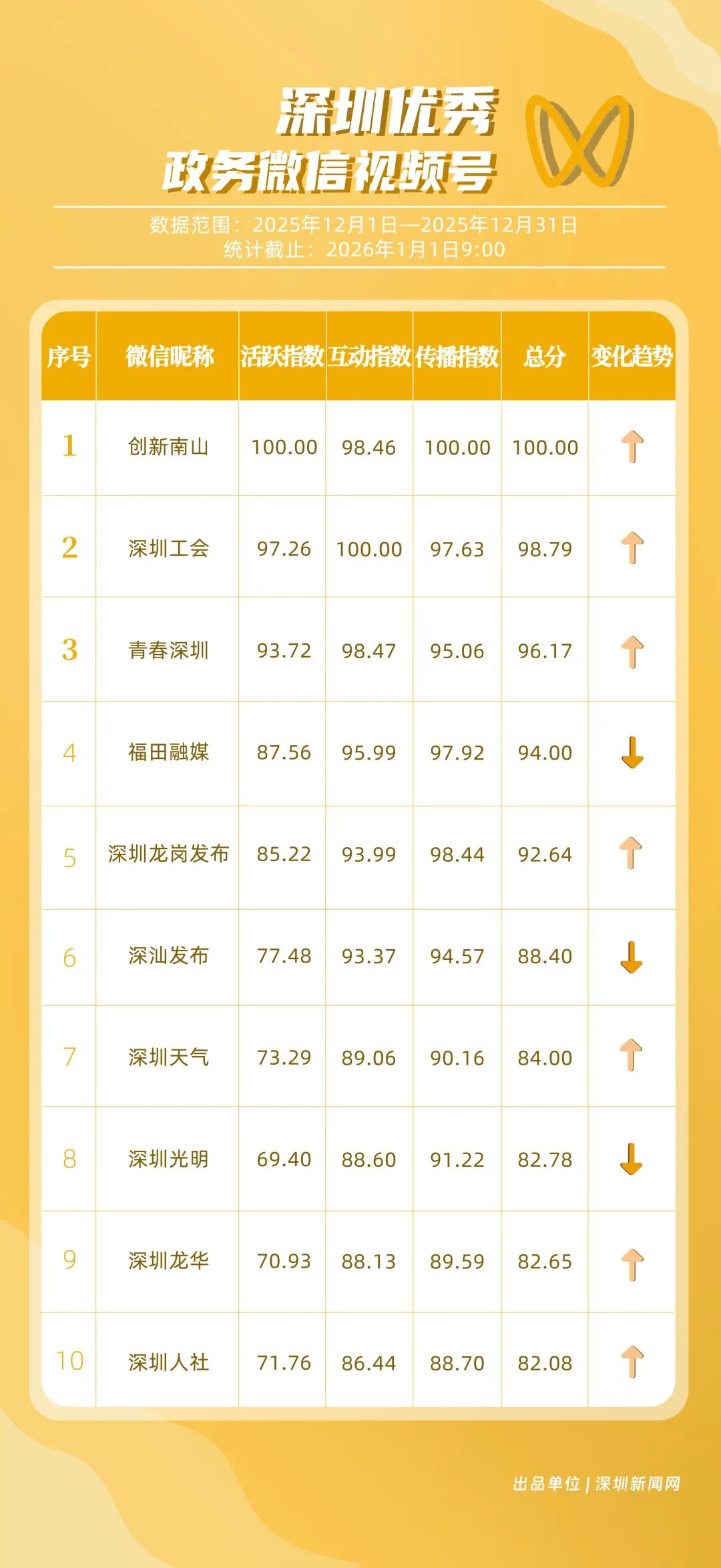 12月,“創(chuàng)新南山”“深圳工會”“青春深圳”“福田融媒”“深圳龍崗發(fā)布”“深汕發(fā)布”“深圳天氣”“深圳光明”“深圳龍華”“深圳人社”榮獲“優(yōu)秀政務(wù)微信視頻號”稱號。“創(chuàng)新南山”活躍指數(shù)、傳播指數(shù)均獲滿分,月作品總轉(zhuǎn)發(fā)量超70萬,領(lǐng)跑榜單;“深圳工會”積極發(fā)布熱點、民生類內(nèi)容,精準對接市民需求,排名上升至第二名;“青春深圳”互動指數(shù)超98分,以高互動量位列榜單第三名。“福田融媒”“深圳龍崗發(fā)布”兩賬號立足區(qū)域特色深耕內(nèi)容,得分超90分。上榜微信視頻號以輕量化短視頻為載體,傳播公眾喜聞樂見的政務(wù)、民生內(nèi)容,打造出兼具傳播力與親和力的政務(wù)宣傳新名片。