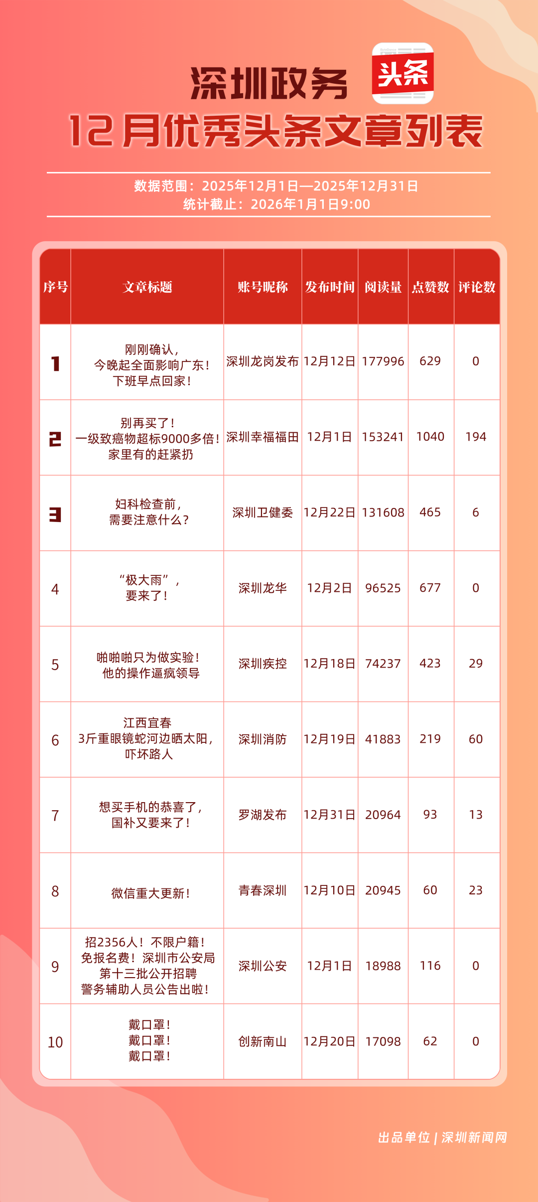 本期榜單數(shù)據(jù)收集自微信(含公眾號、視頻號)、微博、抖音、今日頭條,統(tǒng)計賬號數(shù)量為227個,統(tǒng)計數(shù)據(jù)時間范圍為2025年12月1日至12月31日,截止時間為2026年1月1日9:00。