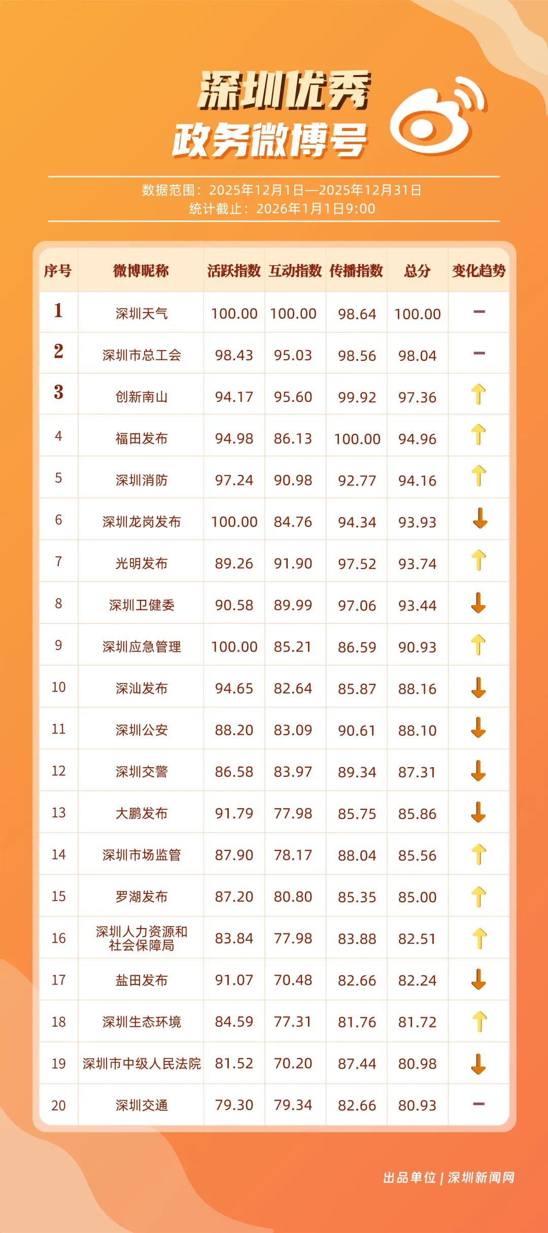 12月,20個賬號入選“優(yōu)秀政務(wù)微博號”榜單,其中包括:“深圳天氣”“深圳市總工會”“創(chuàng)新南山”“福田發(fā)布”“深圳消防”“深圳龍崗發(fā)布”“光明發(fā)布”“深圳衛(wèi)健委”“深圳應(yīng)急管理”“深汕發(fā)布”等。其中,“深圳天氣”精準化發(fā)布天氣信息,高頻次與網(wǎng)民互動,以滿分成績蟬聯(lián)榜首,彰顯其在民生服務(wù)領(lǐng)域的核心價值;“深圳市總工會”積極發(fā)布互動、福利類內(nèi)容,獲得較高用戶參與度與賬號影響力,居于榜單第二;“創(chuàng)新南山”傳播指數(shù)得分超99分,躋身榜單第三。“福田發(fā)布”“深圳消防”等賬號聚焦民生熱點、強化互動運營,居于榜單前列,且排名有所提升。12月上榜政務(wù)微博賬號持續(xù)發(fā)力,實現(xiàn)了政務(wù)信息的有效傳播,為政務(wù)新媒體的內(nèi)容運營與價值傳遞提供了可借鑒的實踐樣本。