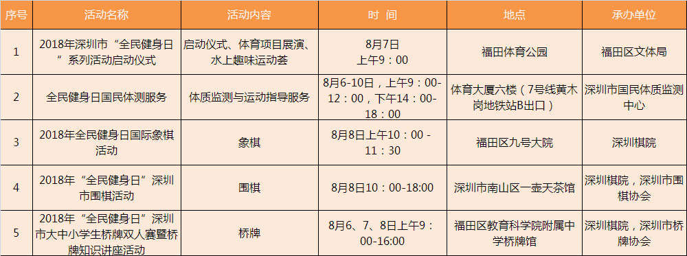 為迎接今年8月8日第十個(gè)全國(guó)“全民健身日”,增強(qiáng)全民健身意識(shí),培養(yǎng)良好的體育鍛煉習(xí)慣,在全社會(huì)形成崇尚健身、參與健身、支持和推動(dòng)全民健身事業(yè)發(fā)展的良好環(huán)境和氛圍,為構(gòu)建和諧社會(huì)發(fā)揮積極的作用,深圳市體育中心積極開展全民健身日免費(fèi)開放系列活動(dòng),于8月8日免費(fèi)開放(深圳體育館、深圳游泳跳水館、深圳網(wǎng)球中心、深圳體育場(chǎng)等四家體育場(chǎng)館,田徑、籃球、廣場(chǎng)體育、游泳、保齡球、壁球和網(wǎng)球7個(gè)項(xiàng)目。