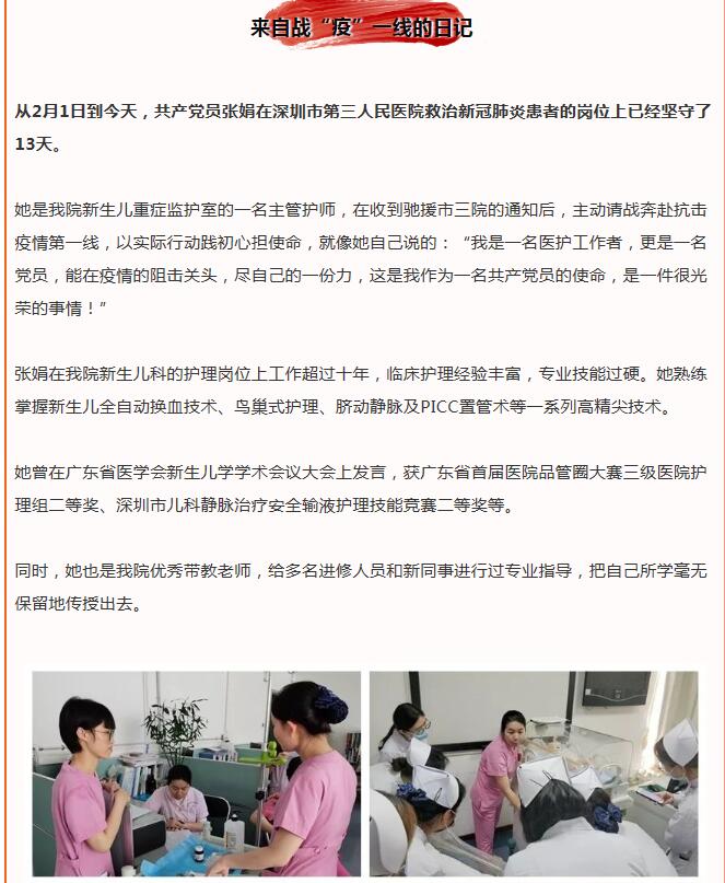 賴碧娟是深圳市婦幼保健院急診黨支部書記、急診科護(hù)士長。作為一名老黨員,抱著“疫情快些得到控制,最大程度減少損失”的信念,新冠肺炎疫情期間,她帶頭沖在一線,整個(gè)春節(jié)期間基本都在醫(yī)院加班?!拔覀兗痹\科全體黨員和醫(yī)護(hù)人員都嚴(yán)陣以待。只要有需要,所有人都沖在一線?!?/p>
