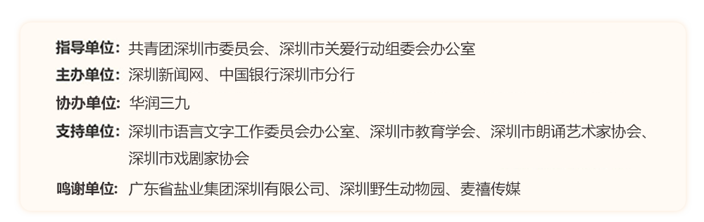 為助力建設(shè)良好的青少年閱讀環(huán)境,激發(fā)學(xué)生閱讀興趣,倡導(dǎo)親子閱讀,共建和諧家庭關(guān)系。2022年,“誰是故事大王·第六季”在共青團(tuán)深圳市委員會、深圳市關(guān)愛行動組委會辦公室的指導(dǎo)下再出發(fā)。活動由深圳新聞網(wǎng)、中國銀行深圳市分行主辦,華潤三九協(xié)辦,得到了廣東省鹽業(yè)集團(tuán)深圳有限公司、深圳野生動物園、麥禧傳媒的大力支持。更長的活動周期,更豐富的參與形式,更專業(yè)的賽制,等你來解鎖與挑戰(zhàn)!讓閱讀成為最動人的風(fēng)景,讓故事的魅力感動深圳。說明:所有參賽者報名成功后,均承認(rèn)并允許主辦方將個人參加本次活動的照片或視頻相關(guān)資料刊發(fā)在各類媒體雜志報紙上,用于活動宣傳。
